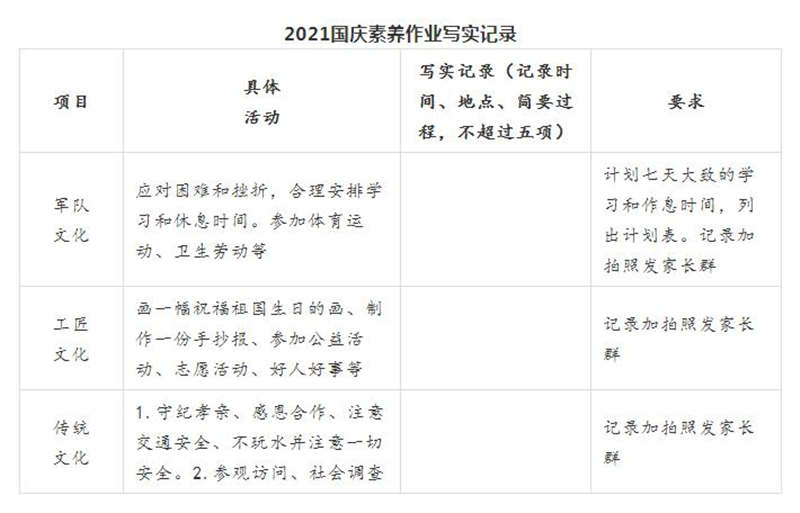 國慶小長假又到了,為了讓孩子們過一個(gè)充實(shí)有意義的假期,我們誠邀各位家長朋友與學(xué)校攜手共同抓好孩子的養(yǎng)成教育,按《2021國慶素養(yǎng)作業(yè)寫實(shí)記錄》要求督促小孩完成。