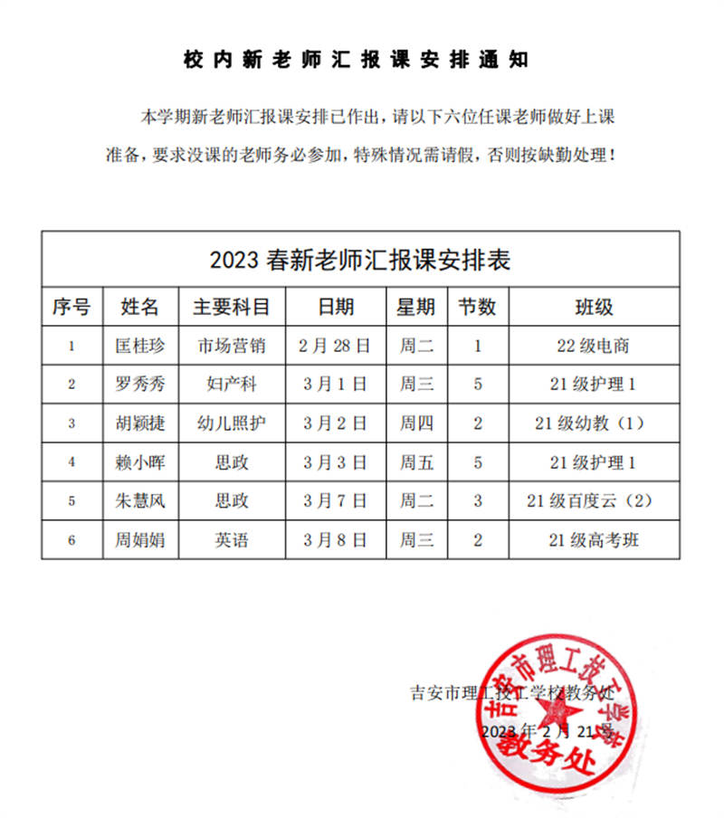 為盡快幫助新教師成長(zhǎng),提高課堂教學(xué)效率,2023年2月21日,吉安市理工技工學(xué)校教務(wù)處發(fā)出《校內(nèi)新教師匯報(bào)課安排通知》,組織開展新教師匯報(bào)課全校展示活動(dòng)。