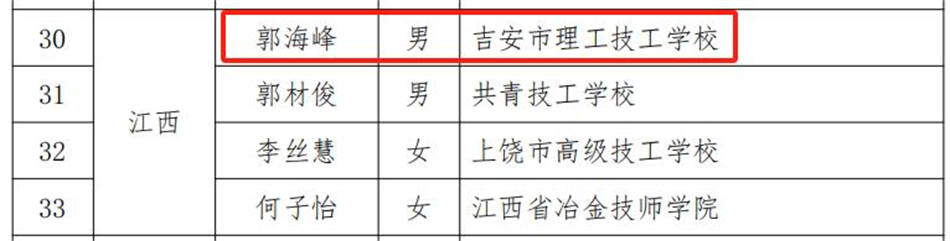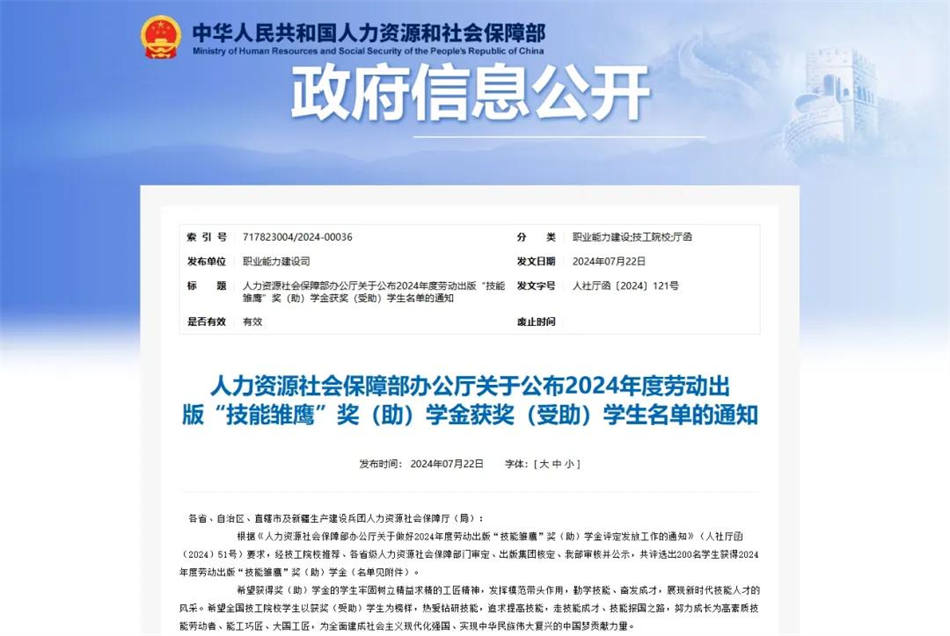 近日,人力資源和社會(huì)保障部辦公廳公布了2024年度勞動(dòng)出版“技能雛鷹”獎(jiǎng)(助)學(xué)金名單,全國(guó)共有200名學(xué)生入選,我校22屆汽車維修專業(yè)郭海峰同學(xué)獲此殊榮。